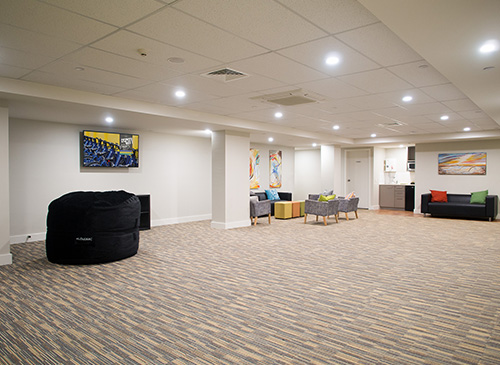Spacious room with large Smart TV, comfortable seating and kitchenetteLower Level Function Room